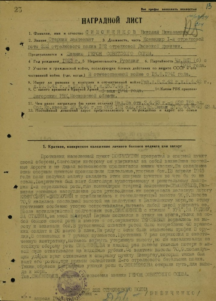 Командир стрелковой роты 232 стрелкового полка 182 стрелковой дивизии старший лейтенант Симоненков принял участие в Восточно-Прусской наступательной операции.