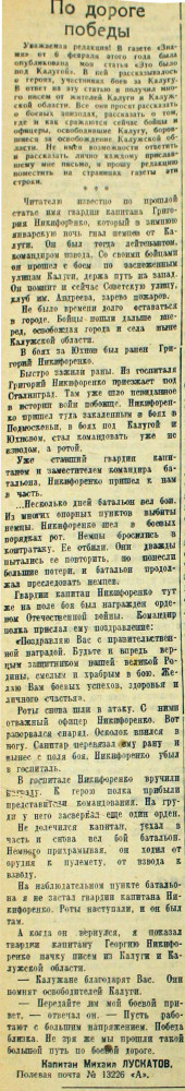 На второй странице этого же номера, капитан Михаил Лускатов рассказал о судьбе гвардии лейтенанта Григория Никифоренко, который в начале войны освобождал Калугу от захватчиков.