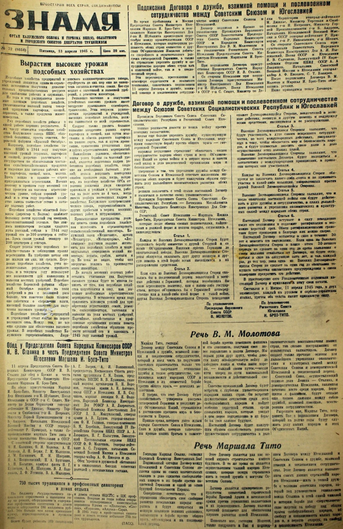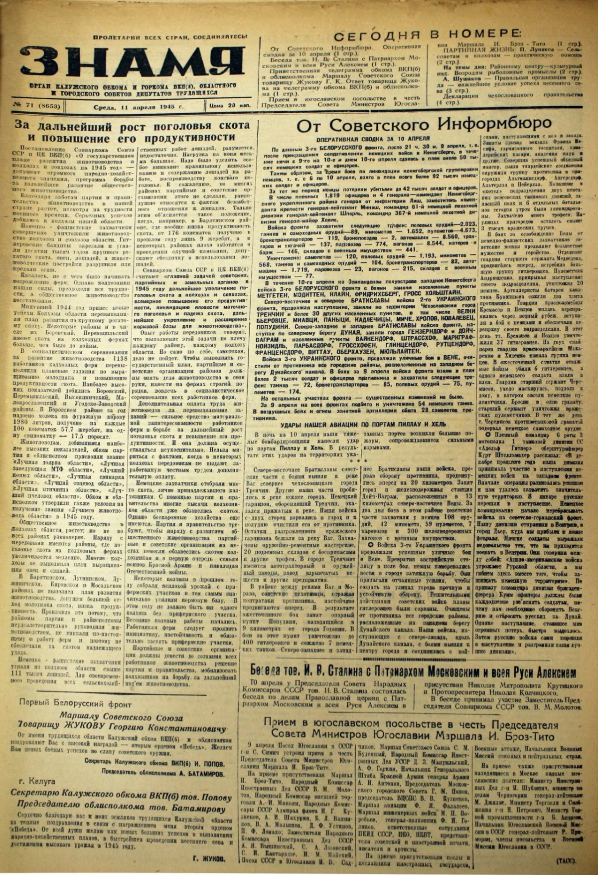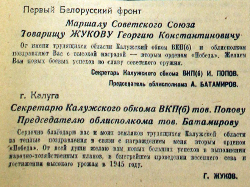 На первой странице «Знамени» в номере от 11 апреля 1945 года калужане поздравляли Георгия Жукова с награждением его вторым орденом «Победа», а ниже – благодарность Жукова за него.