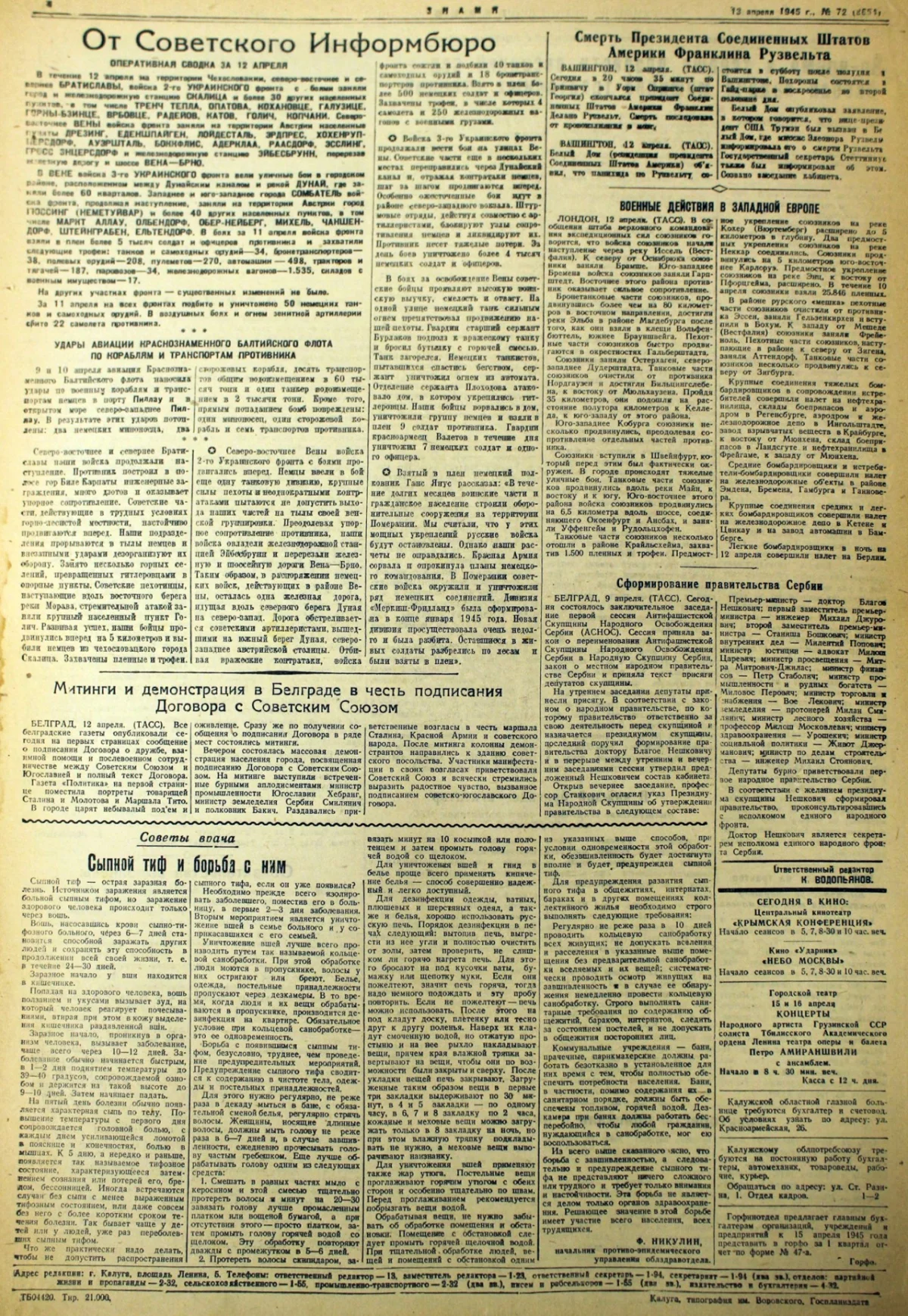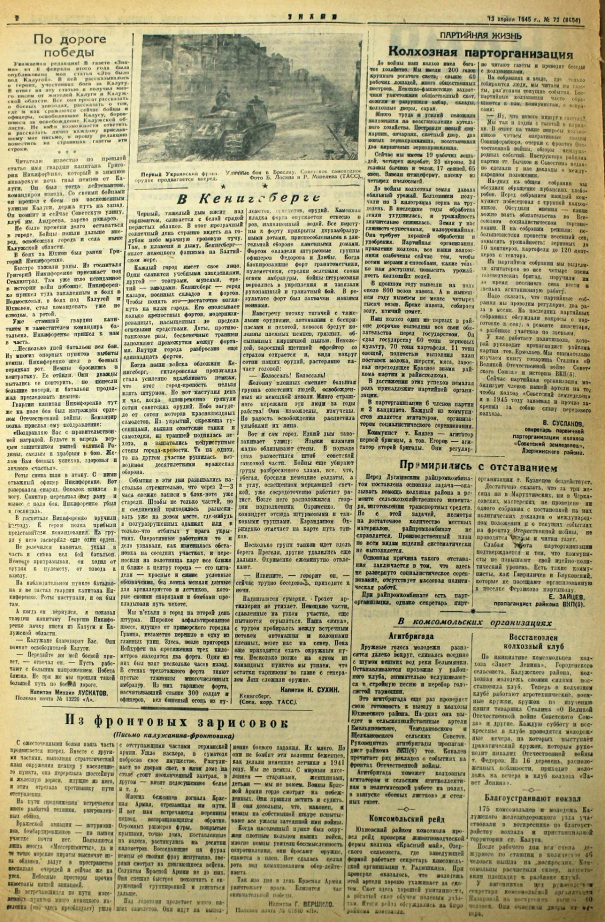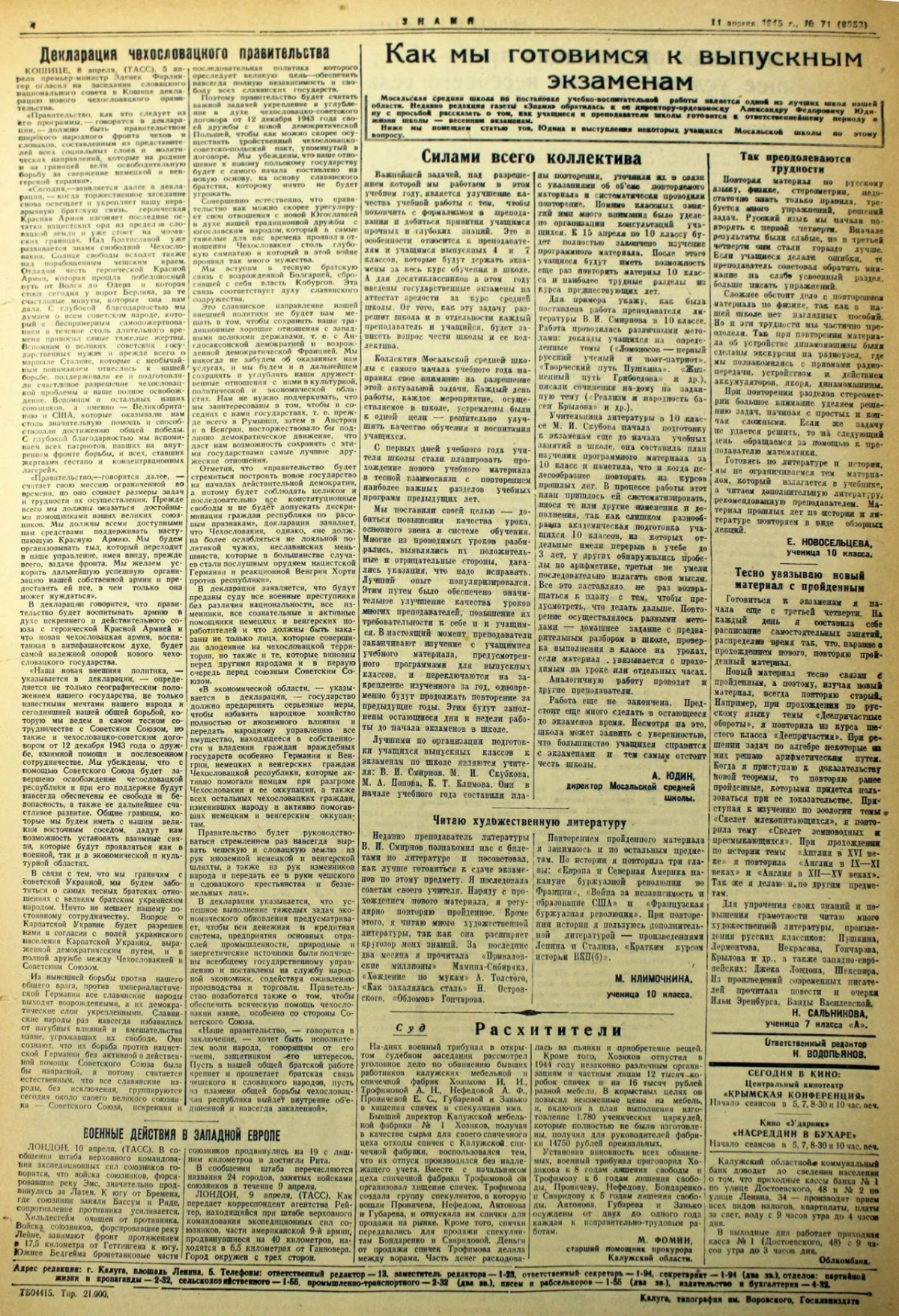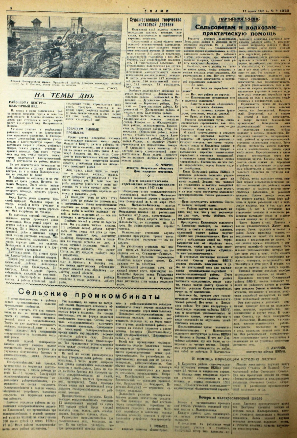 Все статьи номеров газет от11 и 13 апреля вы можете посмотреть в галерее ниже. В четверг, 12 апреля 1945 года, «Знамёнка» не выходила.