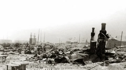 На фото: зима 1942 года, район улицы Салтыкова-Щедрина после освобождения города от немецких захватчиков.