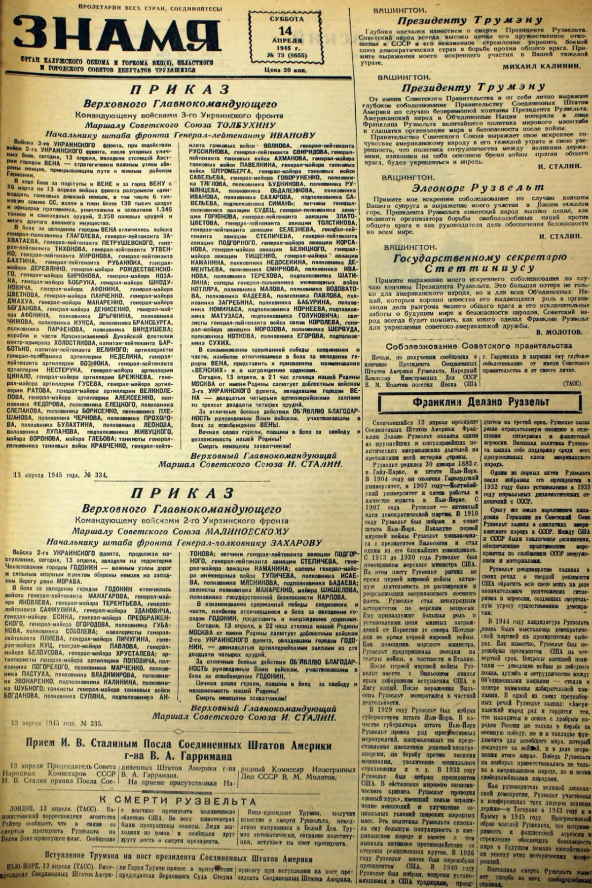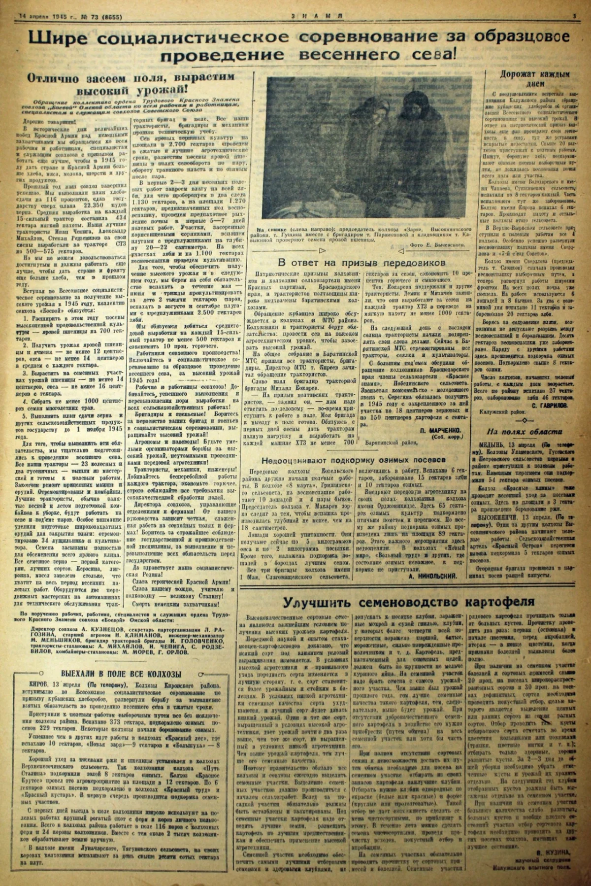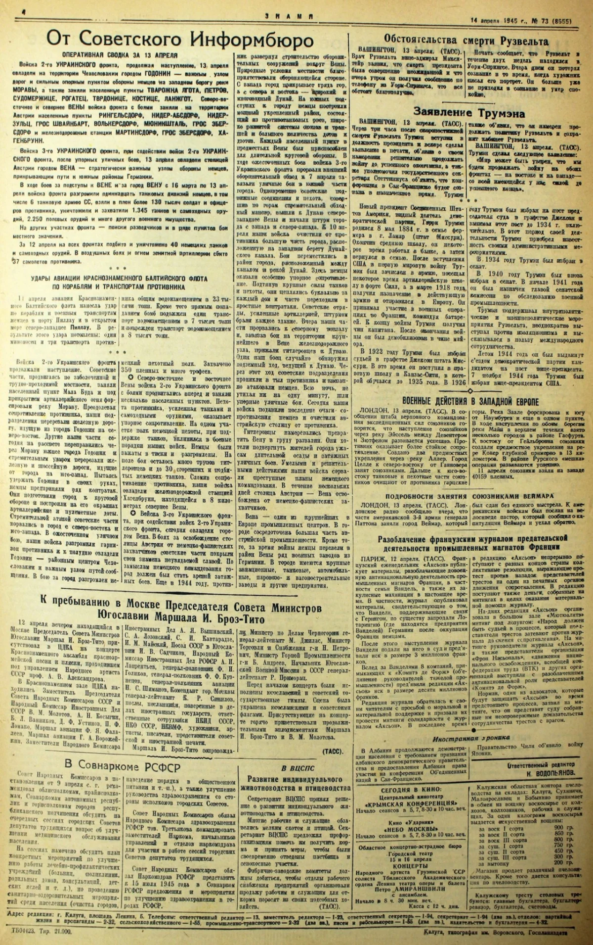 14 апреля: Наши войска продолжают освобождать Балтику и Чехословакию, а в Калуге подводят итоги выполнения мартовских планов