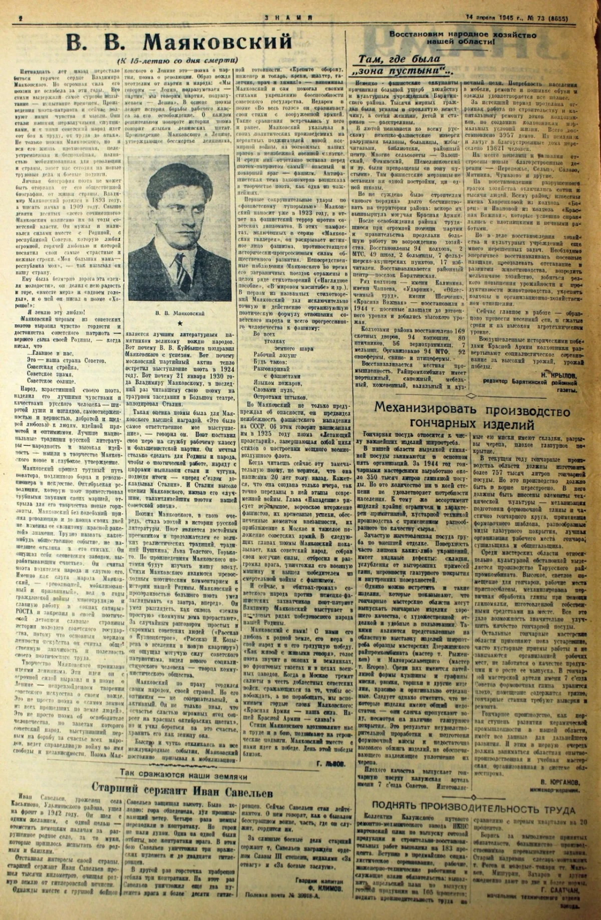 Мартовский план выпуска продукции калужский путевой ремонтно-механический завод народного комиссариата путей сообщения выполнил на 183%. Одновременно с тем «знамёнка» критикует гончарное производство области, которое не может удовлетворить потребности населения и призывает механизировать это производство.