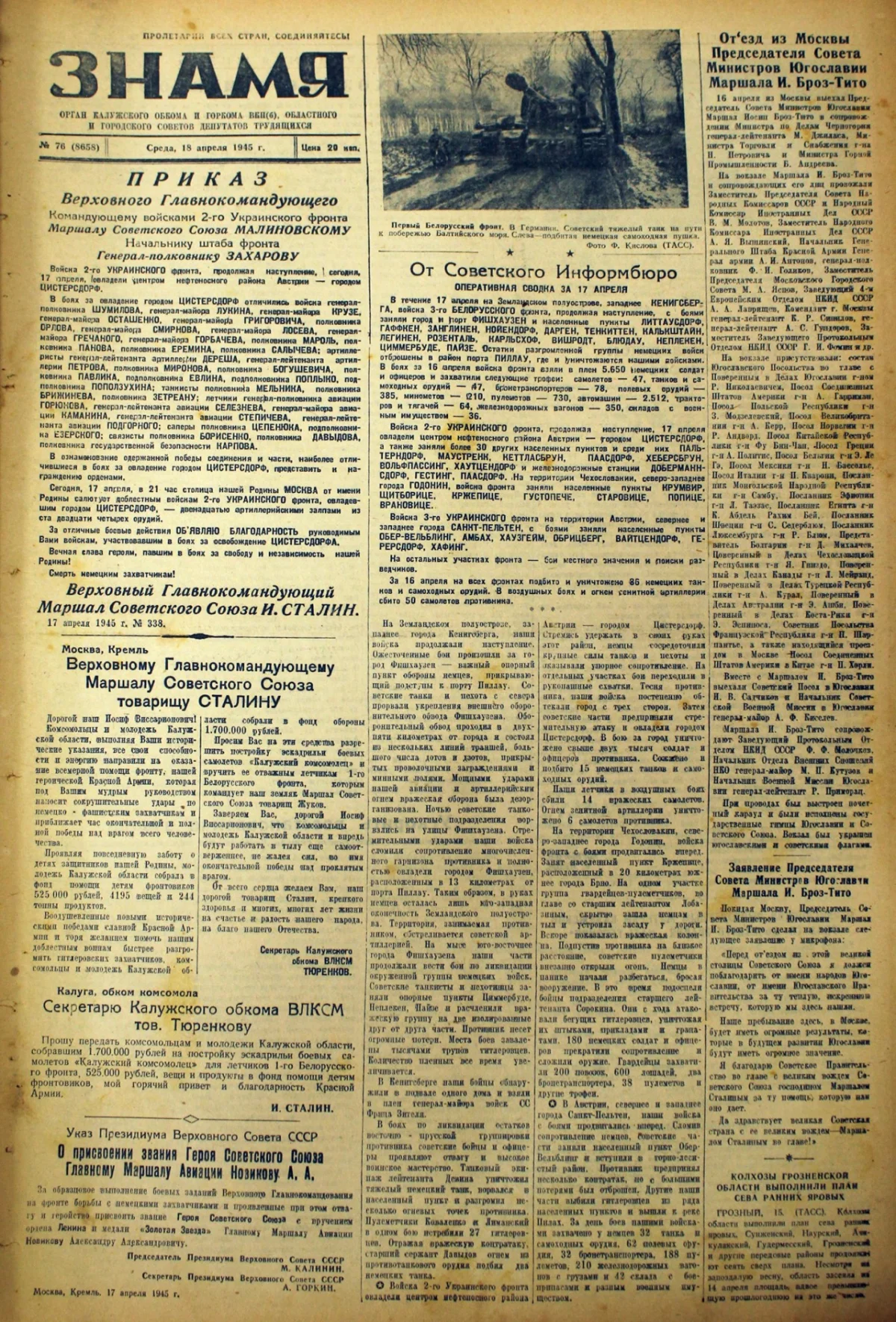 За 18 апреля наши войска подбили и уничтожили 96 немецких танков и самоходных орудий. В воздушных боях и огнём зенитной артиллерии сбито 115 самолётов противника.