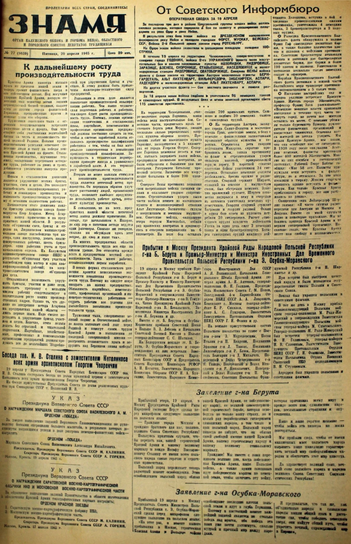 За 19 апреля на всех фронтах подбито и уничтожено 129 немецких танков. В воздушных боях и огнём зенитной артиллерии сбито 140 самолётов противника.