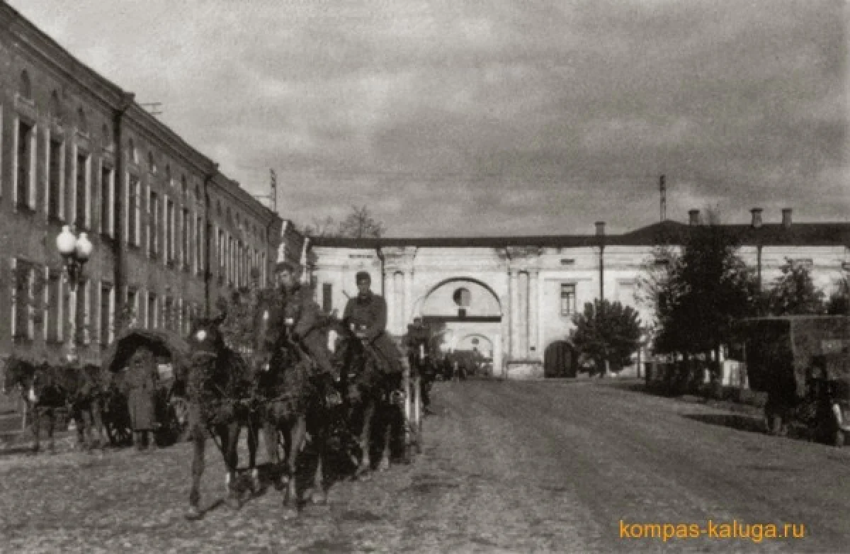 На фото: октябрь 1941 года, немецкая колонна въезжает на площадь Ленина. Видны арки присутственных мест и ограда сквера Ленина.