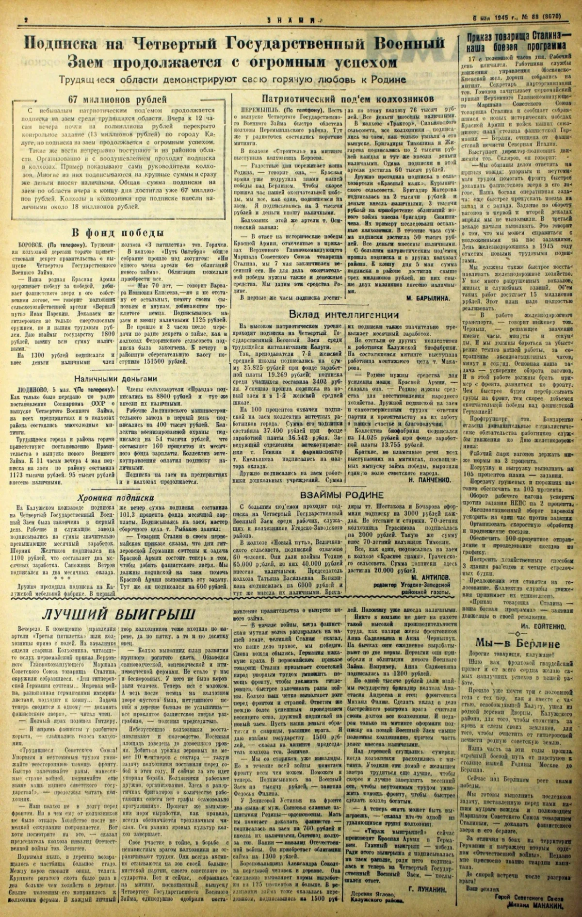 Прошел всю войну и дошел до Берлина, письмо из которого 6 мая 1945 года опубликовала газета «Знамя».