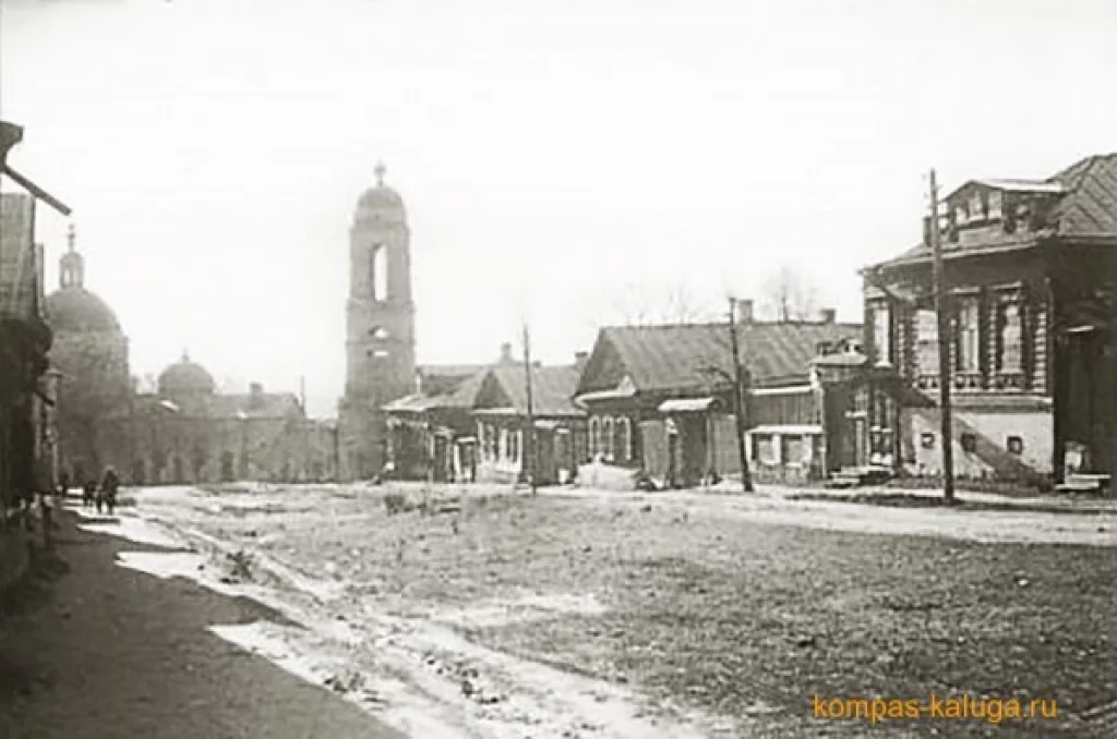 На фотографии, снятой немецким солдатом в октябре 1941 года, во время оккупации Калуги, — улица Энгельса (бывшая Рождественская). Вдалеке виднеется церковь Рождества Христова «в Кожевниках».