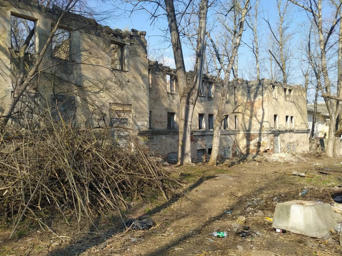 В здании не было окон и дверей, перекрытия частично обрушились, а ограждение повреждено.