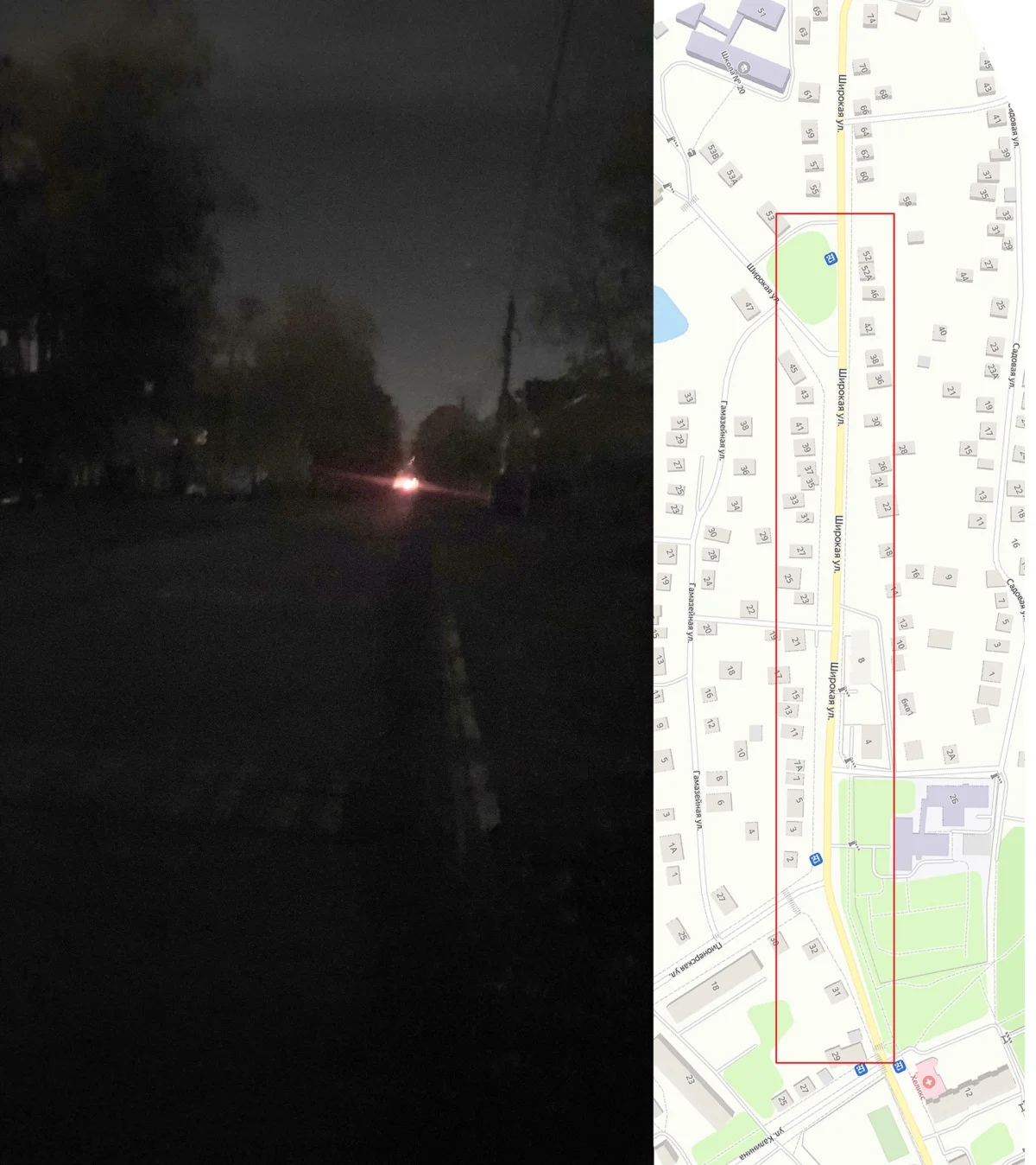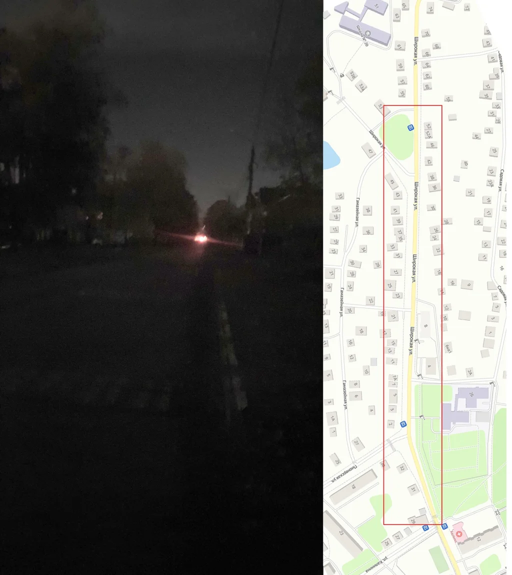 Местный житель 6 октября рассказал, что уже около двух недель не горят фонари на участке от Социалистической, 12 до Широкой, 48.