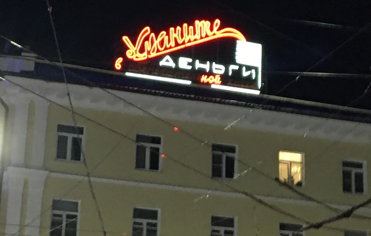 Напомни, вывеску «Храните деньги в сберегательной кассе» установили на крыше дома на перекрестке улиц Ленина и Баррикад в 2022 году.