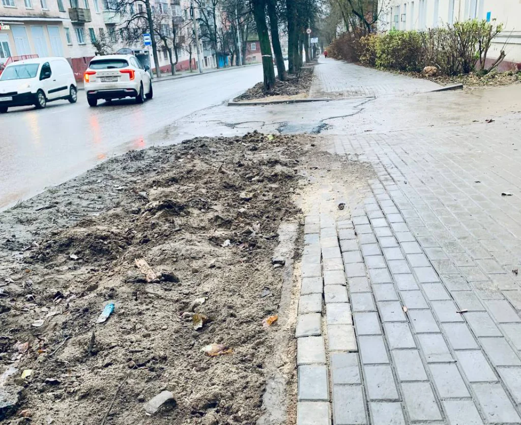 В Калуге тротуар на улице Салтыкова-Щедрина бросили раскопанным