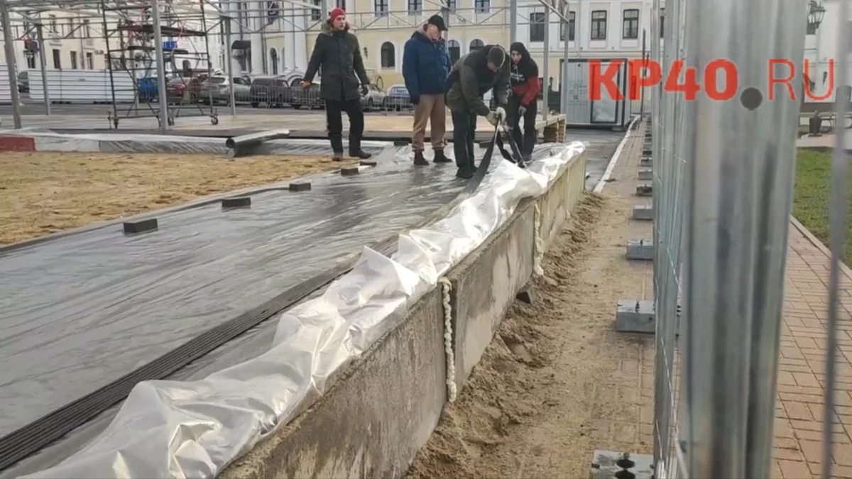 На площади перед областной администрацией в Калуге продолжаются работы по созданию катка.