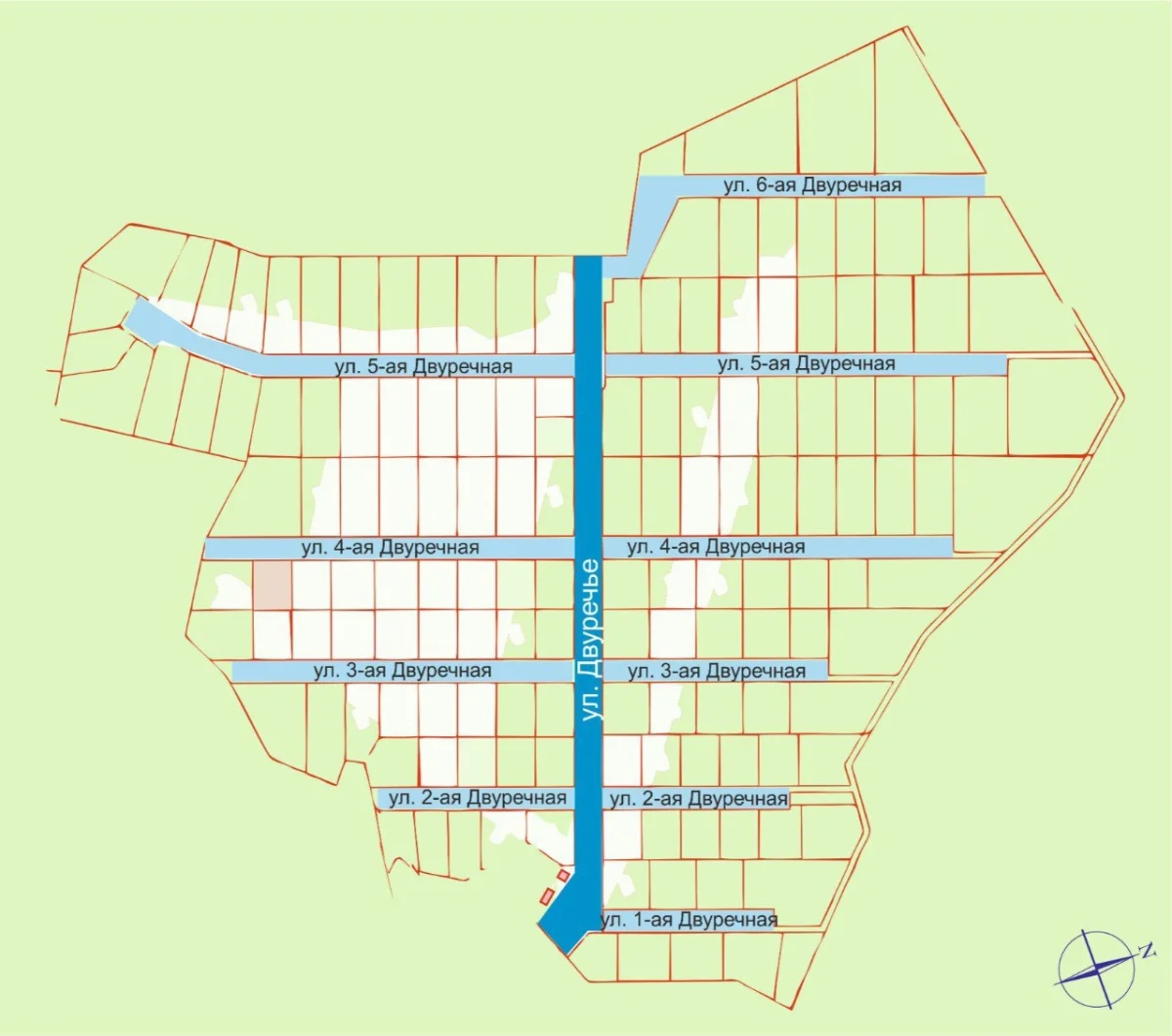 Центральная улица посёлка получит название Двуречье, а перпендикулярные улицы будут 1-ая Двуречная, 2-ая Двуречная, 3-ая Двуречная, 4-ая Двуречная, 5-ая Двуречная и 6-ая Двуречная.