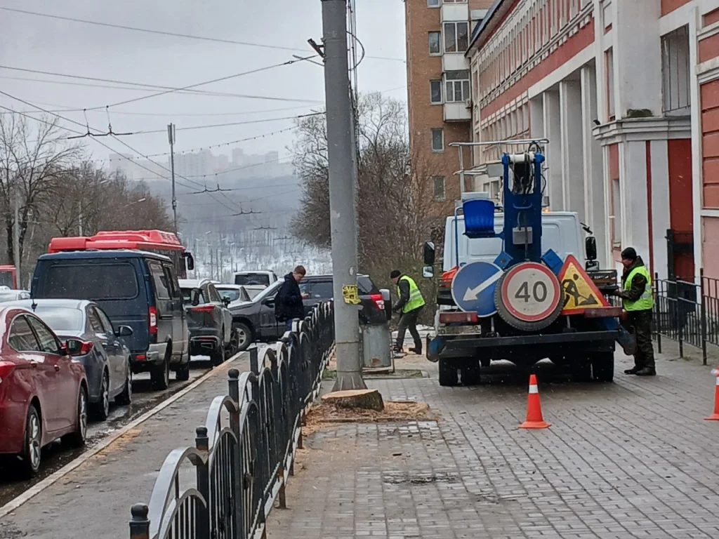 Рабочие срезали несколько деревьев, которые находились между зданием школы и проезжей частью.