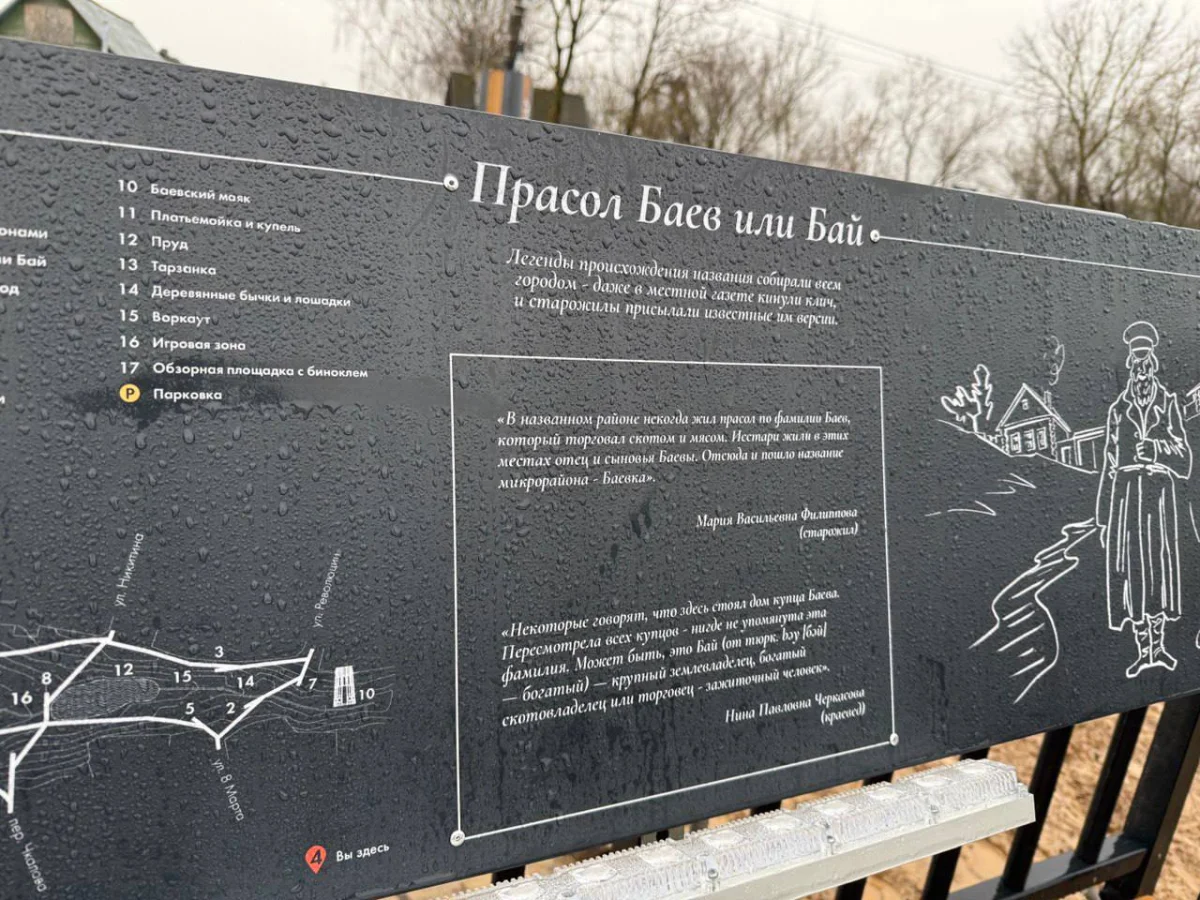 После завершения благоустройства здесь появятся прогулочная аллея со смотровой площадкой, зоны отдыха с лавочками и освещением, архитектурная композиция «Баевский маяк» и декоративные фигуры животных.