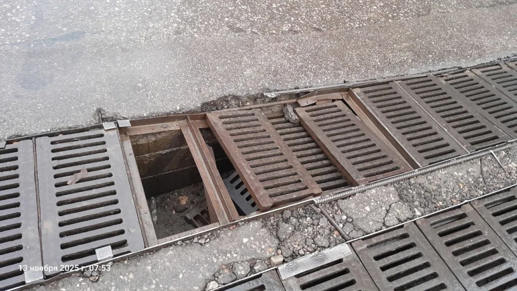 В районе дома №25 на улице Георгия Амелина на Правом берегу провалилась решетка ливневой канализации.