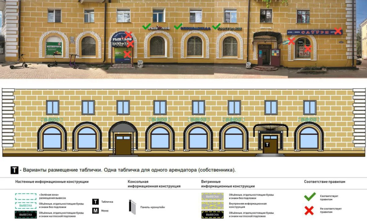 - На сегодняшний день утверждена архитектурно-художественная концепция внешнего облика улицы, - отметил Денисов. - Мы наводим порядок и создаём единый, аккуратный и современный облик: один арендатор или собственник – одна табличка. Без визуального шума и хаоса. Козырьки входных групп должны соответствовать архитектуре здания, его стилю и цветовой гамме. Металлический профлист уходит в прошлое, он больше не используется при отделке. Вывески на козырьках – только из отдельных объёмных или псевдообъёмных букв на непрозрачной основе, со шрифтом, который «дружит» с архитектурой здания. Подложки на вывесках, размещённых прямо на фасадах, запрещены.