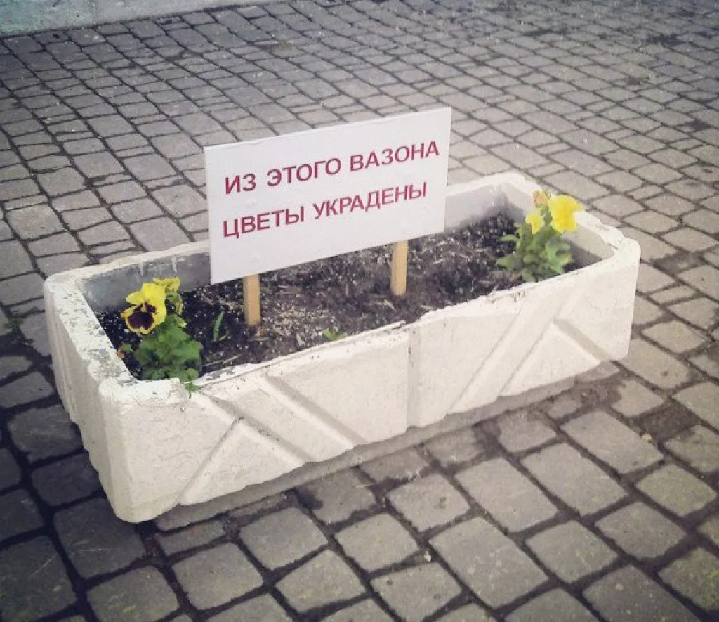 Клумбы возле здания ТЮЗа на улице Театральной в Калуге уже дважды разграбили за последнее время. Работники театра решили пристыдить хулиганов табличкой с надписью «Из этого вазона цветы украдены» (на фото).