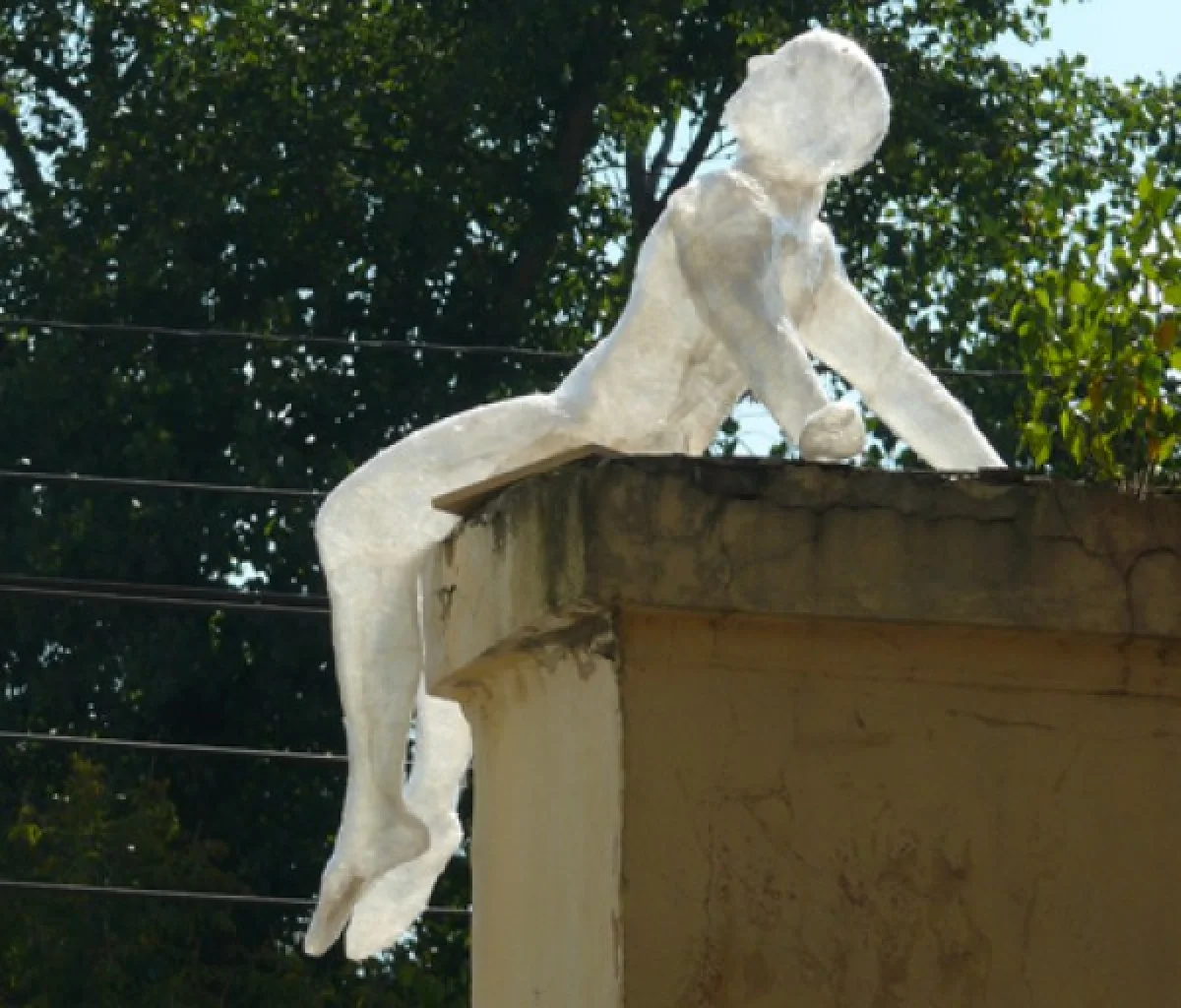 Обе фигуры без лица, выполнены из материала напоминающего обычный скотч. Полупрозрачная скульптура на Кирова похожа на беззаботно загорающего юношу. Кто изваял сие произведение, зачем его усадили на арку нам пока выяснить  не удалось.