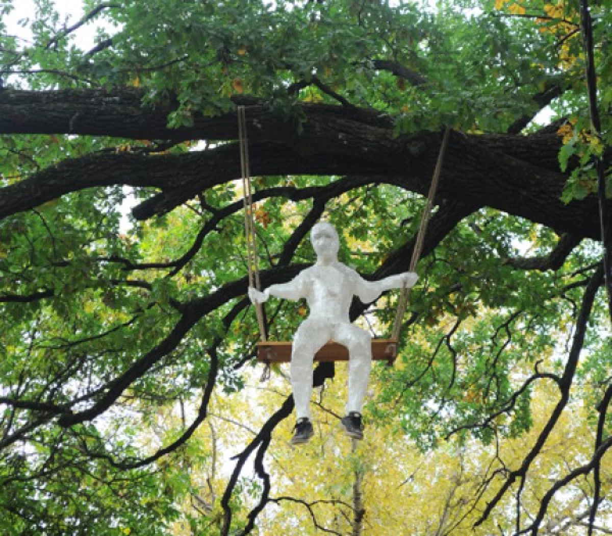 В ночь на вторник, 10 сентября, рядом с корпусом КГУ на Воскресенском переулке в Калуге появилась новая скульптура. Неизвестный автор изобразил человека, который на большой высоте катается на качелях. На ногах у героя кеды.