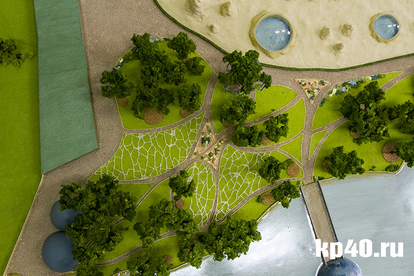 — Парк будет состоять из трёх зон: пляжной, спортивной и развлекательной,— объединённых космической тематикой,— увлечённо рассказывает Ольга.— Вот пляжная зона с детским «лягушатником». Здесь же — кафе «Сатурн».