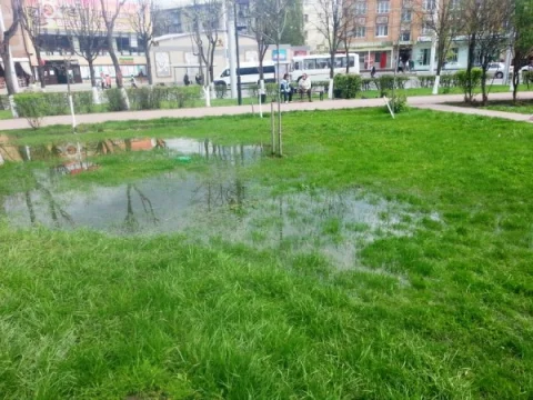 В среду, 4 мая, в «Народных новостях» CID сообщил о том, что после запуска фонтана на площади Победы в зелёной зоне образовалось несколько «озер» (на фото). После этого сообщения фонтан, открытый в конце прошлой недели, осушили.