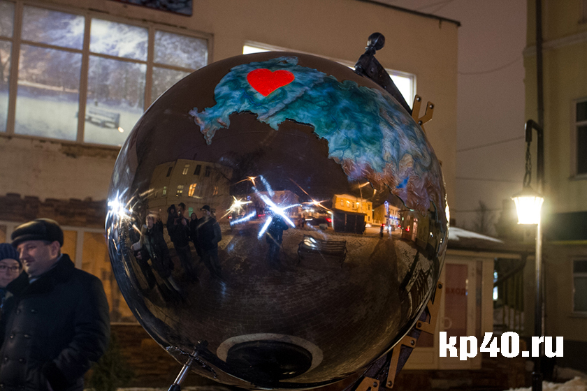 Сфера может вращаться. Наш город отмечен на ней большим красным сердцем. На основании конструкции сделана надпись «Любимый город», на подставке – название: «Калуга».