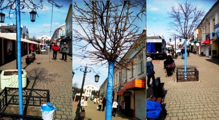 В воскресенье, 9 апреля, активисты во главе с экологом и ландшафтным дизайнером Людмилой Дорофеевой раскрасили клёны на Театральной улице в Калуге в небесно-голубой цвет.