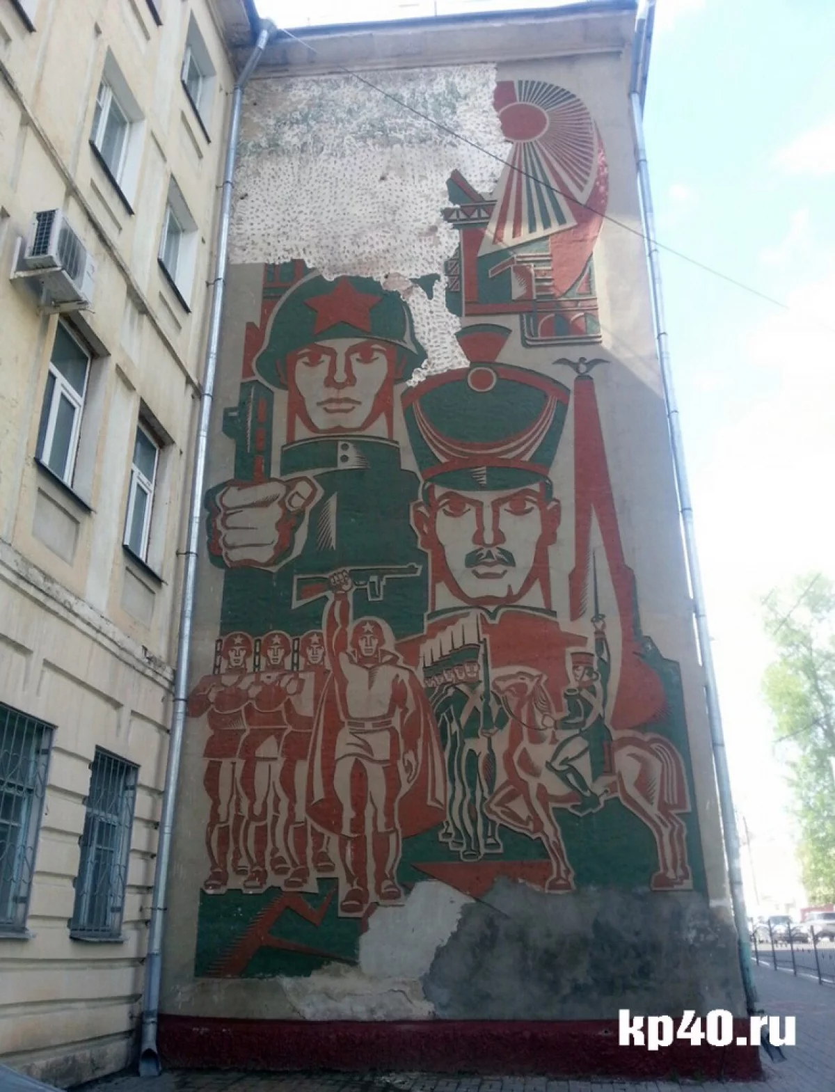 Как мы уже рассказывали, на улице Пушкина в Калуге рассыпается панно на торце жилого дома. Коммунальщики ещё в 2016 году отбили от него куски, опасаясь, что те рухнут на голову прохожим.