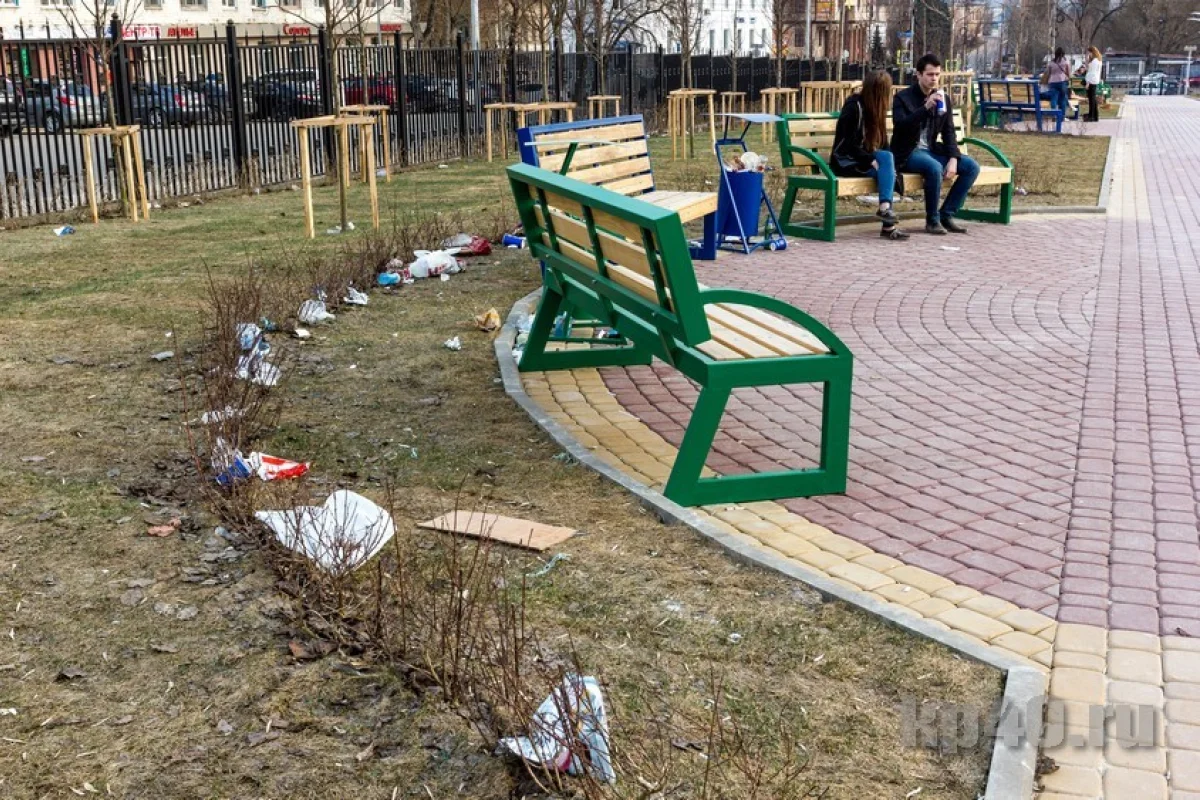 Переполненные пластиковыми бутылками и стаканами урны, загаженные всевозможным мусором газоны – такую картину в течение нескольких недель наблюдали калужане в новом парке на месте рынка. На фоне белого баннера с надписью «Городская среда» этот «пейзаж» смотрелся особенно эпично.