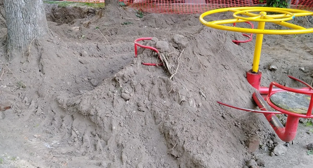 При этом жильцам обещали, что всё аккуратно закопают. Однако вместо этого засыпали землёй детскую карусель.