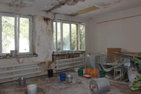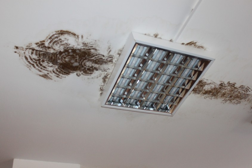 Однако уложиться в сроки, прописанные в контракте, подрядчику не удалось. А из-за того, что во время строительства третьего этажа крышу разобрали, здание во время летних дождей залило до первого этажа. Стены и потолки во многих кабинетах покрылись плесенью.