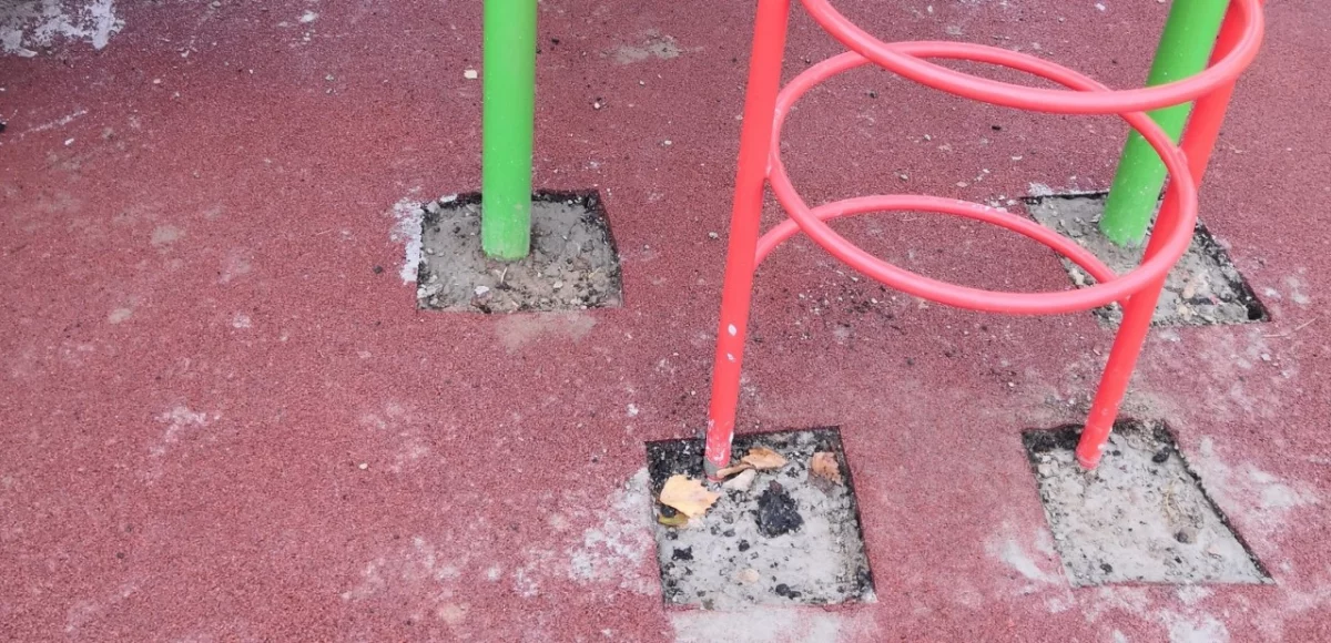 - Это надо было додуматься в начале площадку покрыть резиновой основой, а после вырезать куски для установки детской горки. Насколько я знаю, всегда делали в обратной последовательности.