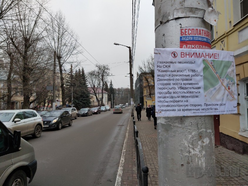 Как мы уже рассказывали, в Калуге несколько месяцев продолжаются ремонтные работы на Каменном мосту. Сначала для пешеходов закрыли левую, если двигаться от Плеханова, часть моста. Затем через некоторое время – правую. В середине декабря даже повесили на столбах таблички, предупреждающие пешеходов о том, что через несколько сотен метров путь перекрыт.