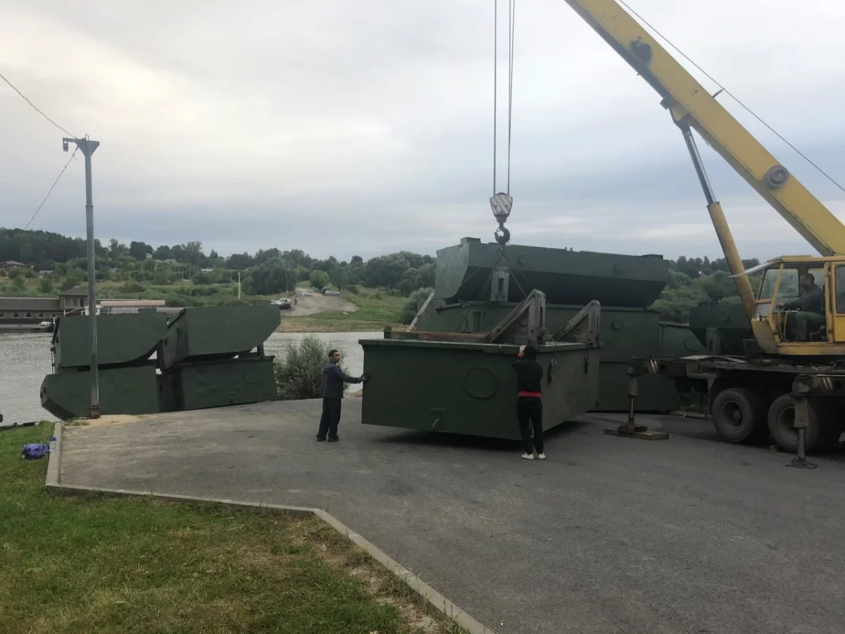 В Калуге начались работы по установке понтонного моста через Оку в районе Воробьёвской переправы. На берег 13 августа начали свозить детали будущего сооружения.