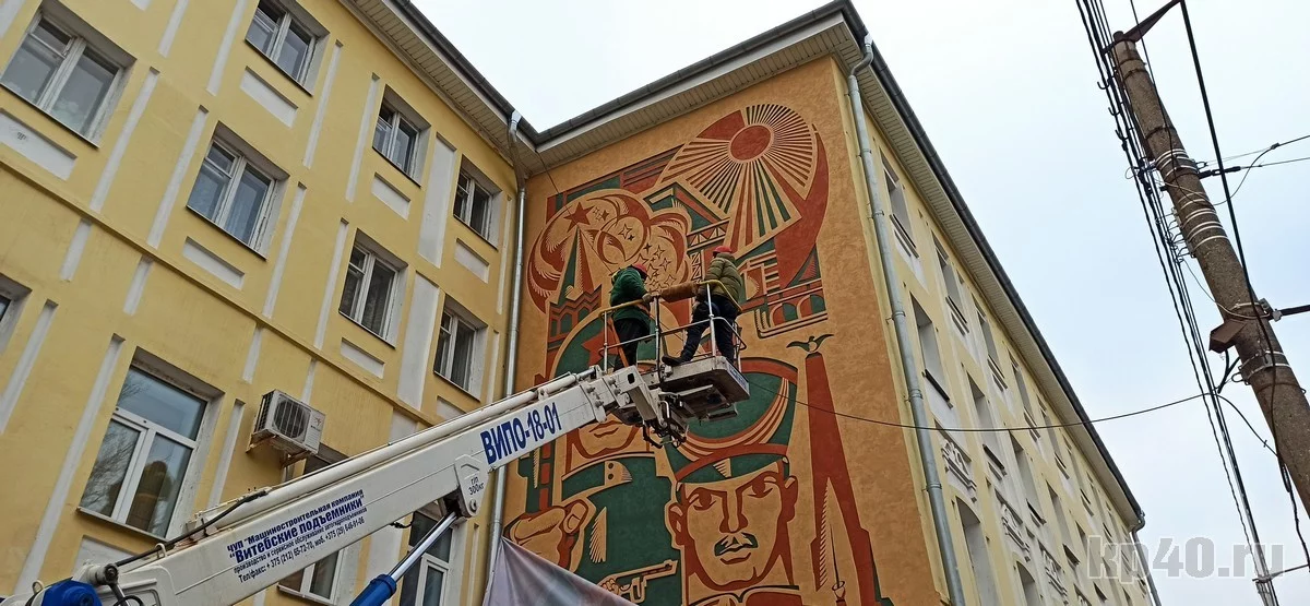 О завершении монтажа, напомним, мы рассказывали на прошлой неделе. Тогда закрепленные поверх штукатурки панели размером 1,2 на 1,2 метра приклеили и покрасили, а сегодня со стены торжественно сняли баннер.