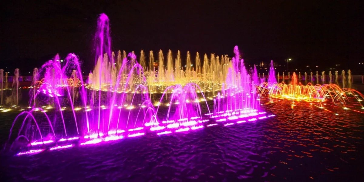 - Данный фонтан планируется как пешеходный, диаметром 25 метров, состоящий из динамических струй в количестве 120 штук, имеющий 8 контуров водных фигур высотой 10 метров с регулировкой наклона струй. Фонтан светомузыкальный с пятью режимами работы: музыкальный, быстрый динамический, медленный динамический, детский игровой и статический.