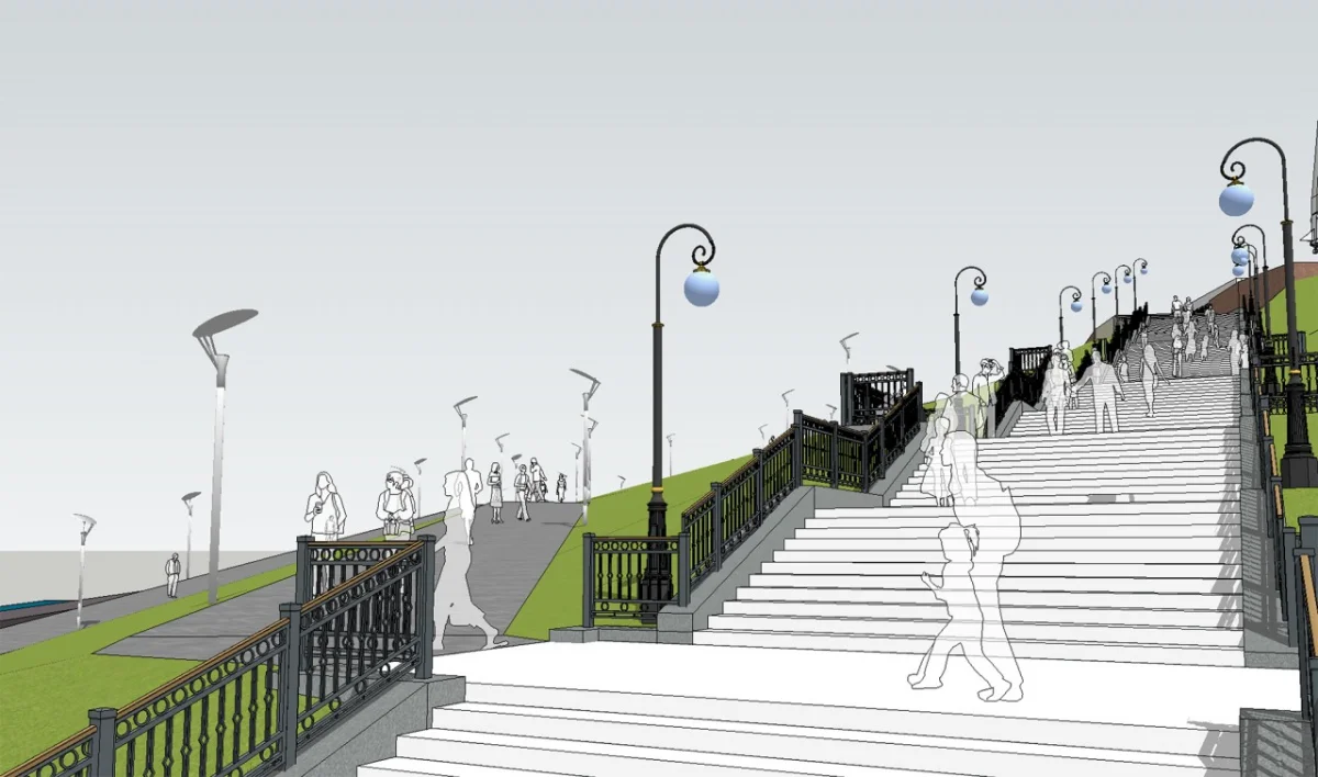 На территории склона предусмотрено устройство пешеходной зоны с покрытием из гранитной высевки. Рядом с дорожками установят 57 фонарей. Откосы укрепят геотехническими матами.