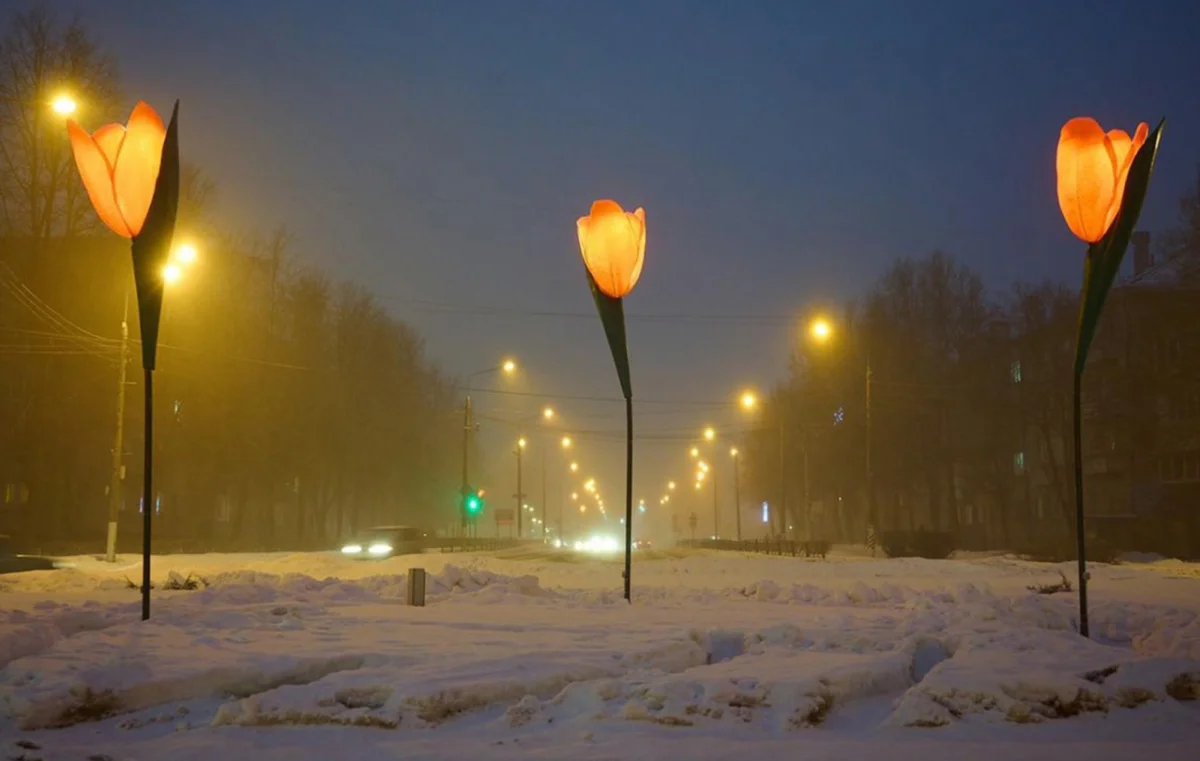 В Обнинске на Треугольной площади установили три огромных тюльпана. В темное время суток они светятся, сообщает в пятницу, 5 марта, пресс-служба правительства Калужской области.