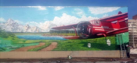 В Калуге на стенах насосной станции у дома №8 по улице Генерала Попова появилось новое граффити. Художник изобразил горы и самолет.