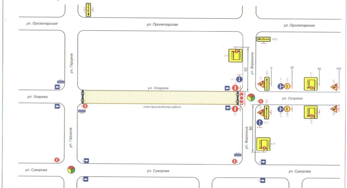 Перекрытие связано с проведением работ по замене водопроводных сетей на улице Огарева.