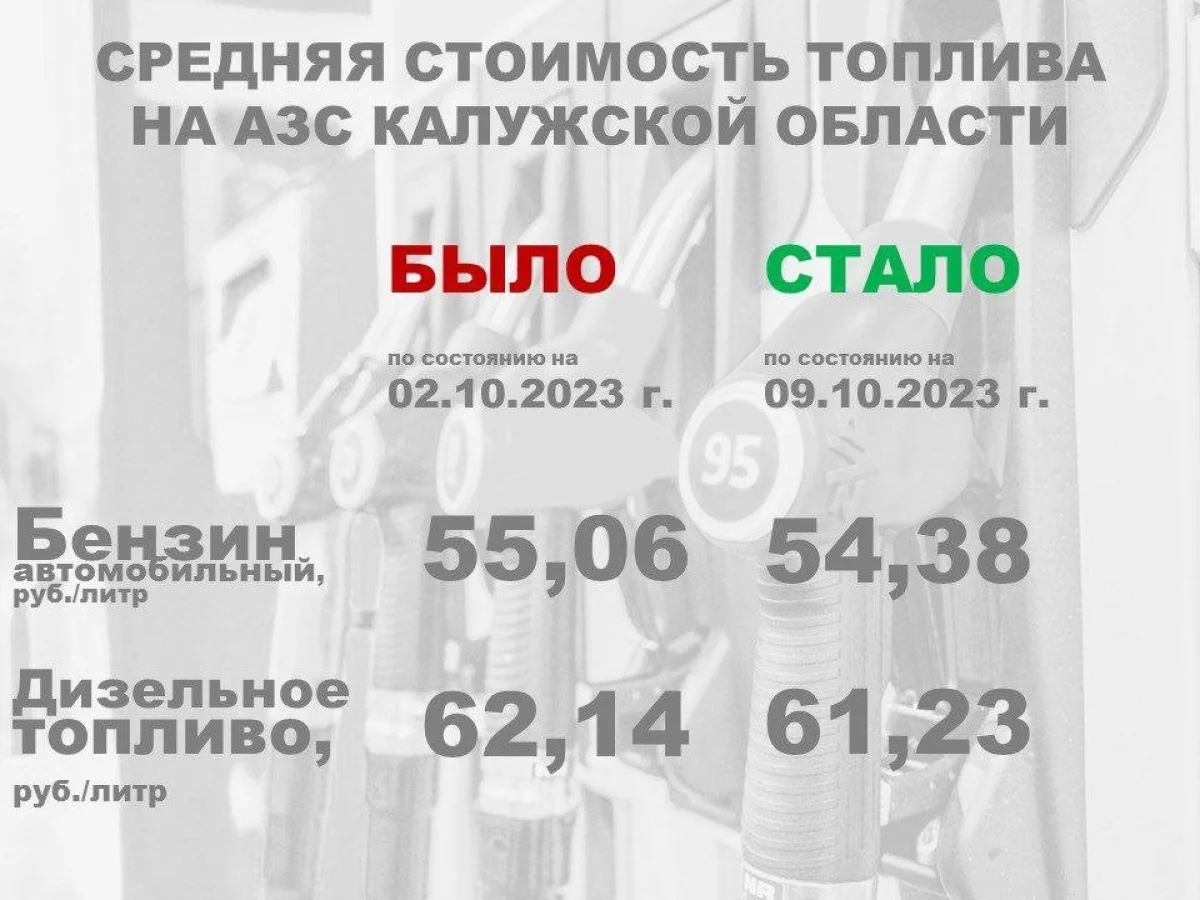 За последнюю неделю в Калужской области значительно снизились оптовые цены на автомобильное топливо. Бензин подешевел на 9,08%, дизель – на 6,64%. Такие данные в пятницу, 13 октября, опубликовало правительство региона по итогам заседания, которое провел заместитель министра конкурентной политики Лев Марченков.