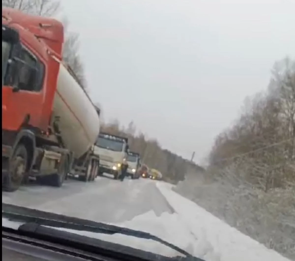 По словам раздраженных водителей, на трассе Калуга - Таруса из-за снега образовалась большая пробка. Также, судя по словам автора видео, на данном участке дороги в фуру врезалась машина.