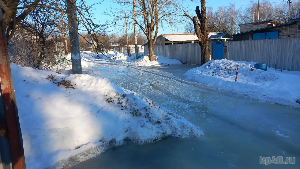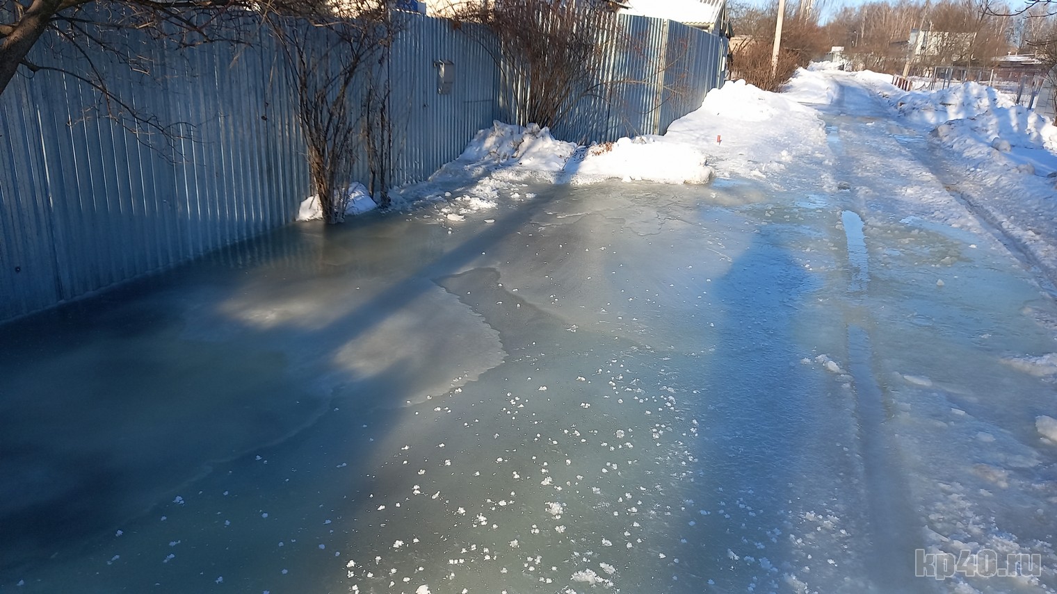 Участок улицы Новой в микрорайоне Бушмановка в Калуге затопило. Разлившаяся вода быстро замерзла, рассказал наш читатель.
