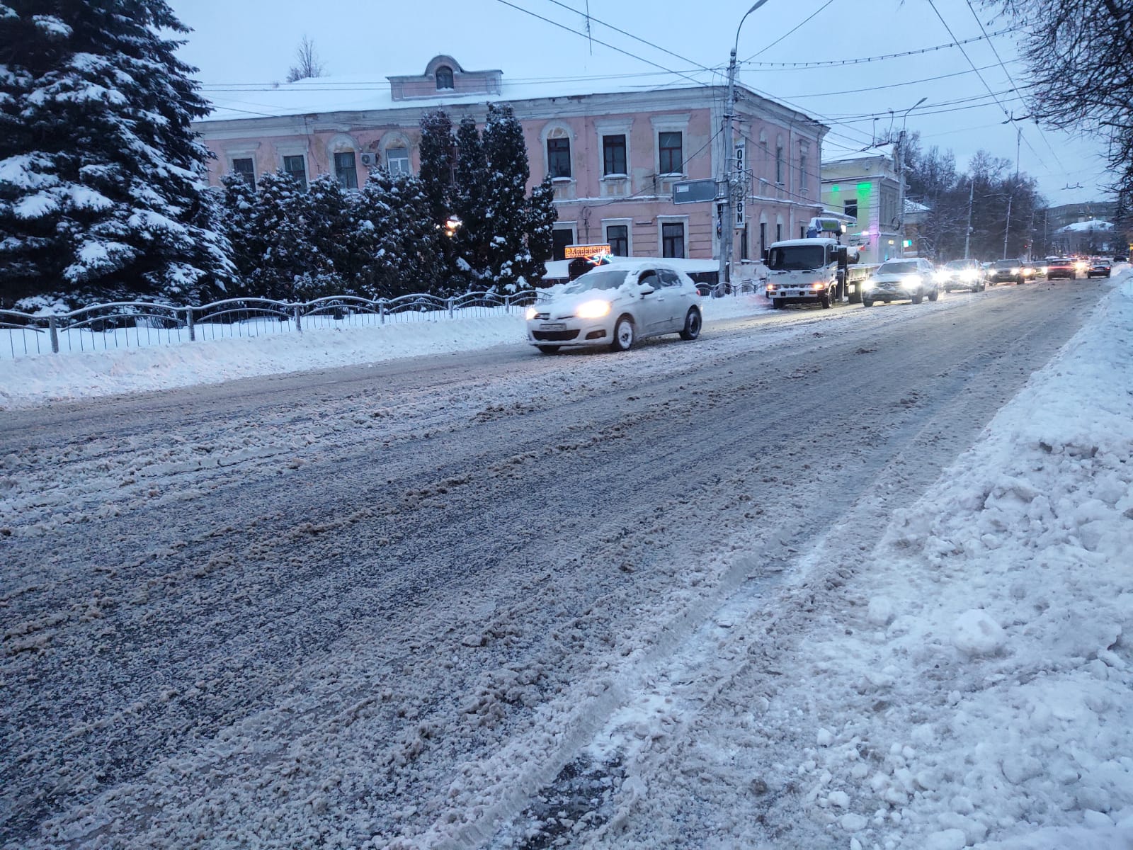 Основные дороги ночью расчистили, но проезжая часть везде сужена. На выездах из дворов снежная каша.