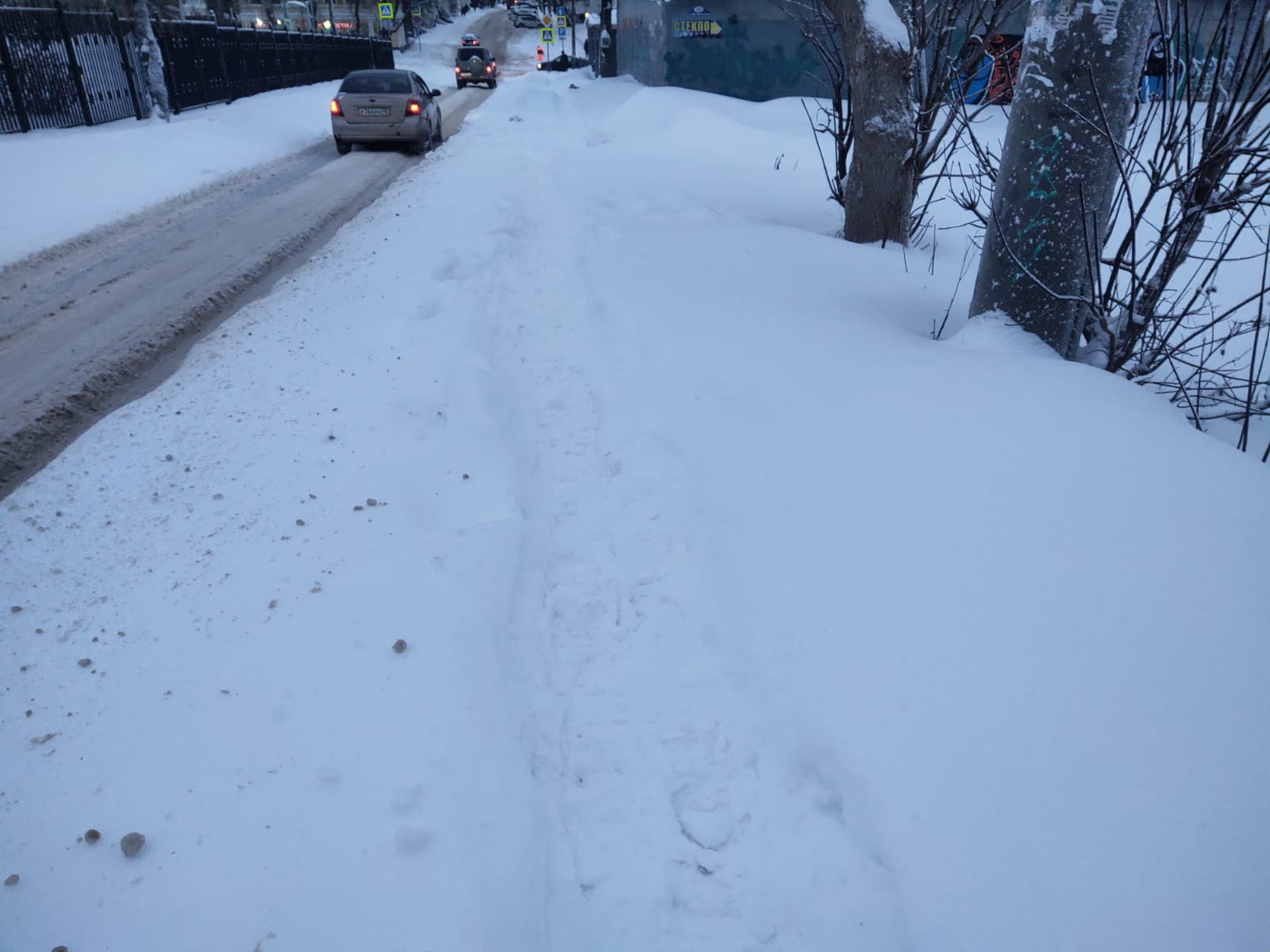 Большие страдания доставляет и передвижение по городу для пешеходов. Сначала глубокий снег во дворе, потом заснеженные тротуары и заваленные отвалами подходы к переходам.