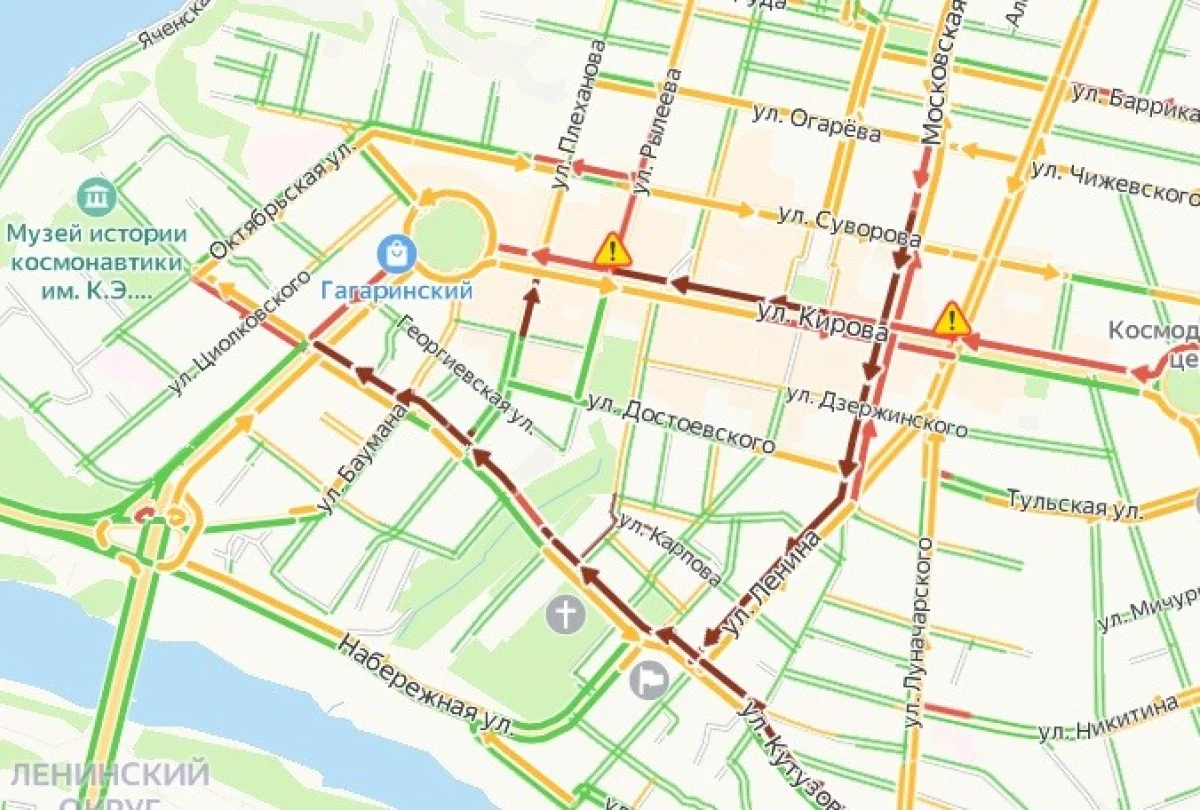 Вечером во вторник встали улицы Кирова, Гагарина, Кутузова, Баженова, Пушкина, Королева, площадь Старый Торг, Московская, Ленина, Рылеева и Плеханова.