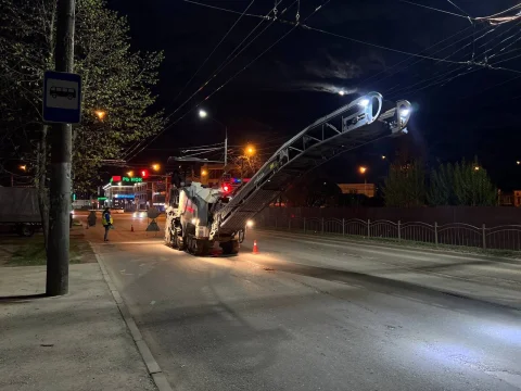 Дорожники начали снимать старый слой асфальта в районе перекрестка с Грабцевским шоссе ночью 24 апреля.