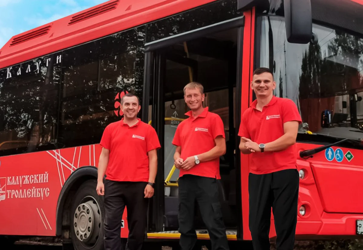 Водителям «Управления калужского троллейбуса» выдали красные рубашки-поло.